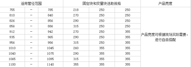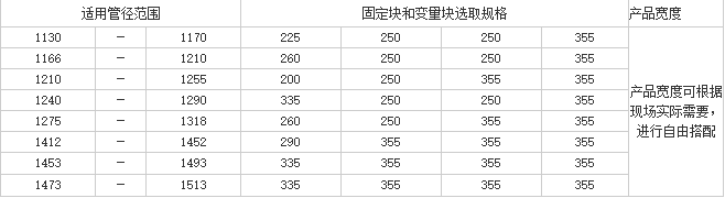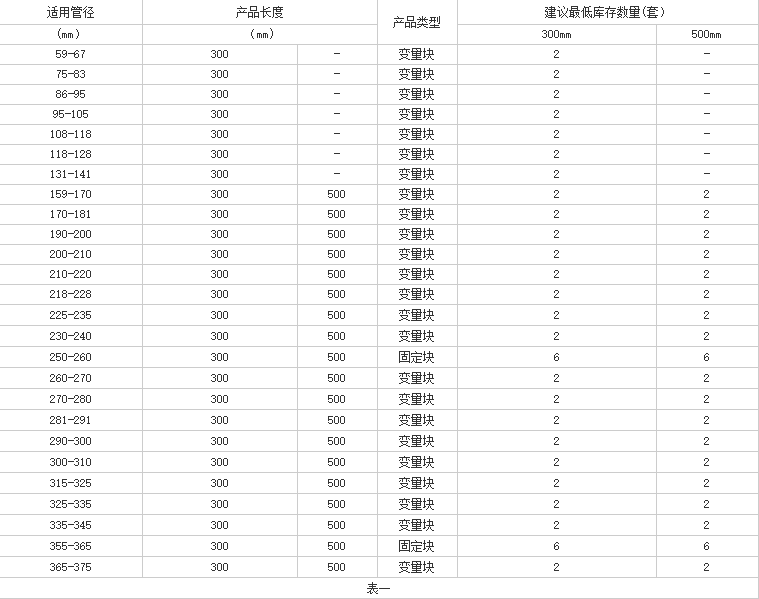 根據(jù)上述單獨管徑的配備,對應(yīng)常用其他管徑的裝配表如下:
