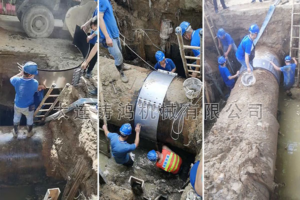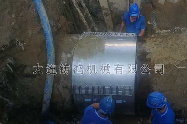 佛山市禪城區(qū)供水有限公司發(fā)現(xiàn)一處管道發(fā)生泄漏, 管道外徑1420mm,管道壓力4公斤左右,漏點(diǎn)10mm,管道材質(zhì)為鋼管,用鑄鴻無限延長修補(bǔ)器兩片長度500mm完美解決漏水問題。