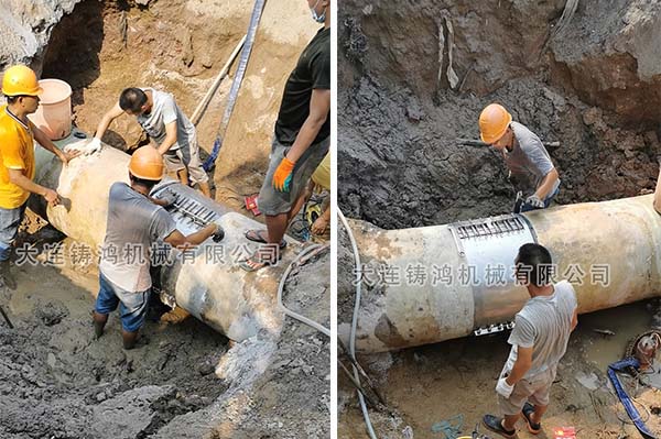 博鰲論壇期間,海南瓊海水務(wù)發(fā)現(xiàn)dn800的玻璃鋼夾砂管粘糊處發(fā)生泄露,管道漏點(diǎn)處空間狹窄,管道凹凸不平,修補(bǔ)起來(lái)較為棘手,由于現(xiàn)場(chǎng)不能停水,不能使用粘糊方式進(jìn)行修復(fù),選擇備貨的管道修補(bǔ)器修補(bǔ),由于沒(méi)有相應(yīng)外徑產(chǎn)品備貨。簡(jiǎn)單處理后,使用萬(wàn)能片無(wú)限延長(zhǎng)修補(bǔ)器快速搭接出管徑,完成修補(bǔ)。