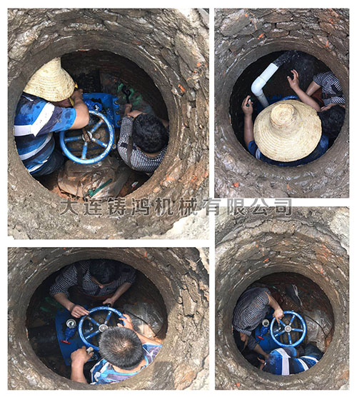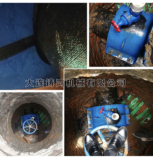 現(xiàn)場情況:閥門一側(cè)法蘭連接處有漏點(diǎn),此水管屬于重要供水線路,無法停水作業(yè);水管口徑300MM。使用法蘭修補(bǔ)器進(jìn)行帶壓堵漏,通水后無泄漏情況。