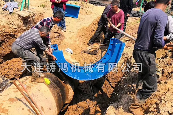 徐州粵海水務(wù)DN1200鋼管承口,水泥插口異性材質(zhì)承插口處泄漏,空間狹小,選用鑄鴻全包型承插口修補(bǔ)器進(jìn)行修復(fù)。經(jīng)過現(xiàn)場(chǎng)工作人員的努力,僅用1.5小時(shí)完成修復(fù)。