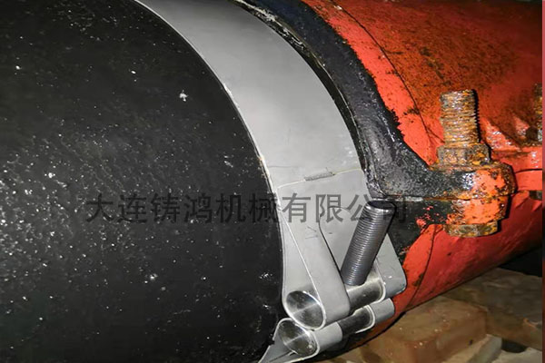洛陽DN400球鐵管道泄漏,漏點位置是在距離哈夫節(jié)根部附近,漏點不大正在滴水,漏點周圍都有腐蝕麻坑,壓力4公斤,由于一邊是哈夫節(jié),另一邊空間有限,可用空間距離僅為100mm,經(jīng)過技術(shù)部門討論后建議采用RCE修補器,另一邊加個固定卡子固定,現(xiàn)場只安裝了REC修補器就密封住了,搶修非常成功。