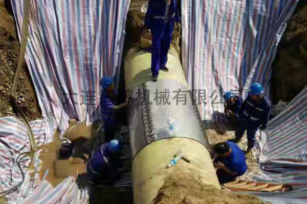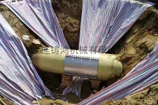 70周年國慶期間,北京水務集團發(fā)現某路段管線流量異常,經過排查,鎖定一處DN1200玻璃鋼夾砂管,挖開后發(fā)現管體破損泄漏,原先修補都是采用傳統的粘糊方式進行修復,修復時間至少需要30個小時以上,并且需要停水,此次使用鑄鴻板式修補器進行快速帶壓修復,不到 2個小時安裝完畢,恢復正常供水。由于產品的突出性能和時效,已經被北京水務集團列入搶修后勤保障配件。